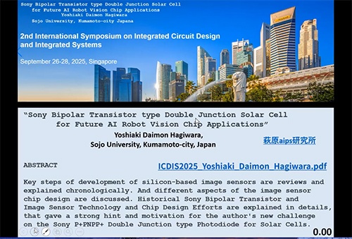 Yoshiaki Daimon Hagiwara, Professor from Sojo University, Japan, delivered a keynote speech on Sony Bipolar_Tansistor type Double Junction Solar Cell_for Future AI Robot Vision Chip Appplications.